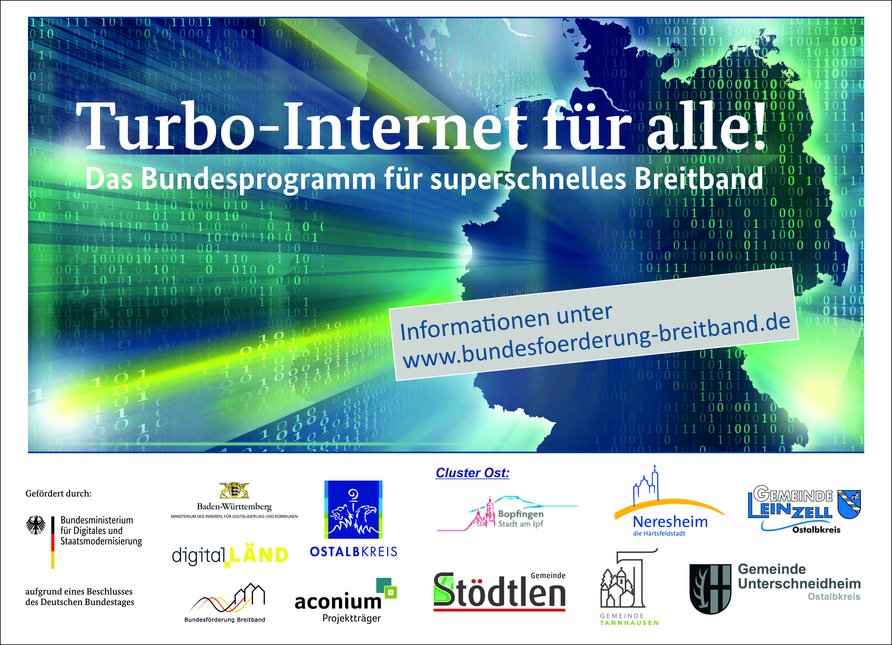 Nach dem Zusammenschluss der Gemeinden Bopfingen, Neresheim, Leinzell, Stödtlen, Tannhausen und Unterschneidheim zum sogenannten „Cluster Ost“ wurde am 21.09.2023 beim Bund eine Förderantrag für den Ausbau der sogenannten „Grauen Flecken“ gestellt. Nach dessen Prüfung anhand eines vom Bundesministerium für Digitales und Verkehr freigegebenen Kriterienkataloges wurde der Antrag prior (fast lane) förderwürdig eingestuft.